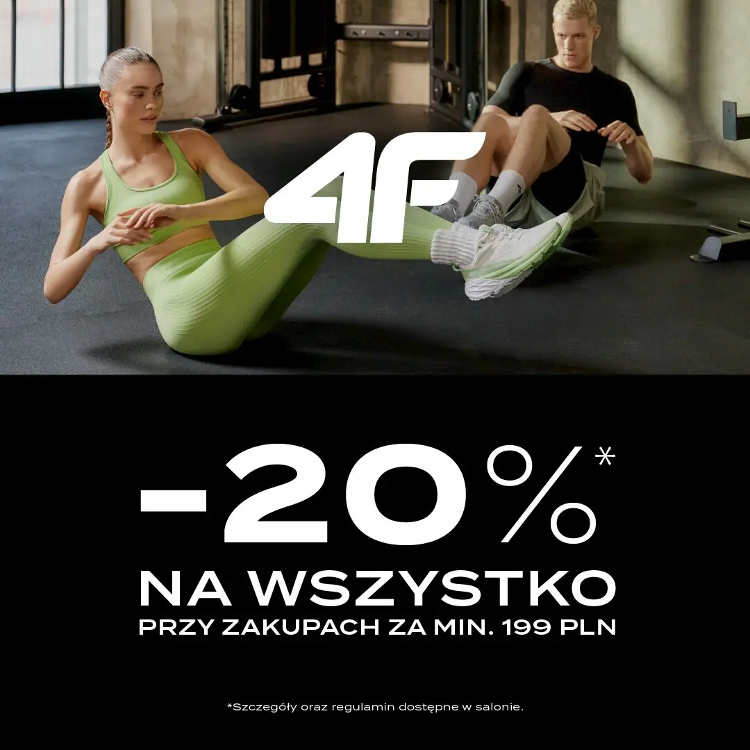 -20% na wszystko przy zakupach za min. 199PLN. Promocja obowiązuje w sklepie 4F oraz 4F JUNIOR.