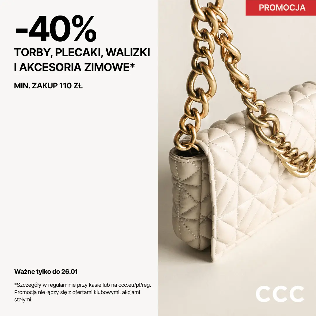 Stwórz zimową stylizację z CCC! -40% na wszystkie torebki, walizki, plecaki i akcesoria zimowe od najlepszych marek. Zrób zakupy za minimum 110 zł i ciesz się zimą w swoim stylu! Nie przegap okazji, oferta ważna do 26 stycznia.