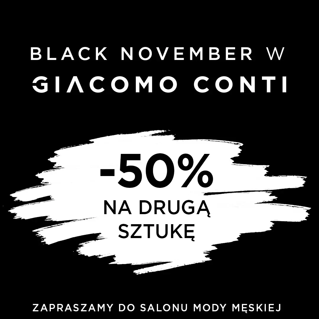 Świętuj z nami BLACK FRIDAY! Już teraz w salonie mody męskiej Giacomo Conti WIELKIE rabaty! TYLKO TERAZ -50% NA DRUGĄ SZTUKĘ! Nie czekaj, takie promocje zdążają się raz w roku.