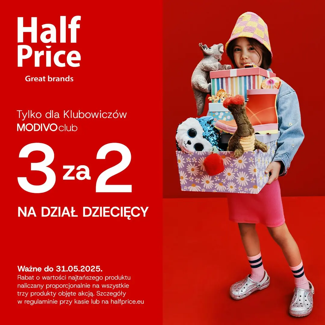 W HalfPrice trwa akcja 3za2 na produkty z DZIAŁU DZIECIĘCEGO – tylko dla Klubowiczów MODIVOclub!Kupuj taniej zabawki, odzież, piżamy, akcesoria szkolne, buty i akcesoria. Wybierz 3 produkty objęte akcją, a rabat w wysokości ceny najtańszego z nich naliczymy przy kasie. To idealny moment na prezent lub po prostu okazyjne zakupy.