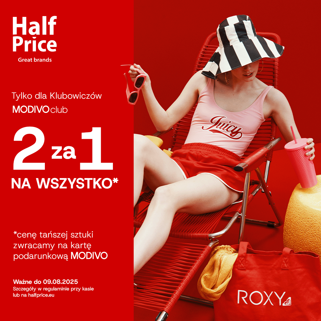 W HalfPrice trwa akcja 2 za 1 na wszystko – kup dwa produkty z ABSOLUTNIE CAŁEJ oferty, a wartość tańszego z nich wróci do Ciebie na kartę podarunkową MODIVO.